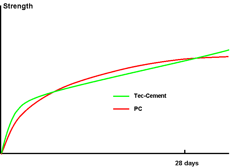 Tec-Cement is made by blending a small amount of reactive magnesia[1] with conventional hydraulic cements like Portland cement. As the magnesia[1] hydrates it consumes water forming brucite hydrates which can later deliver more water for the more complete hydration of other hydraulic cement components adding to long term strength development.