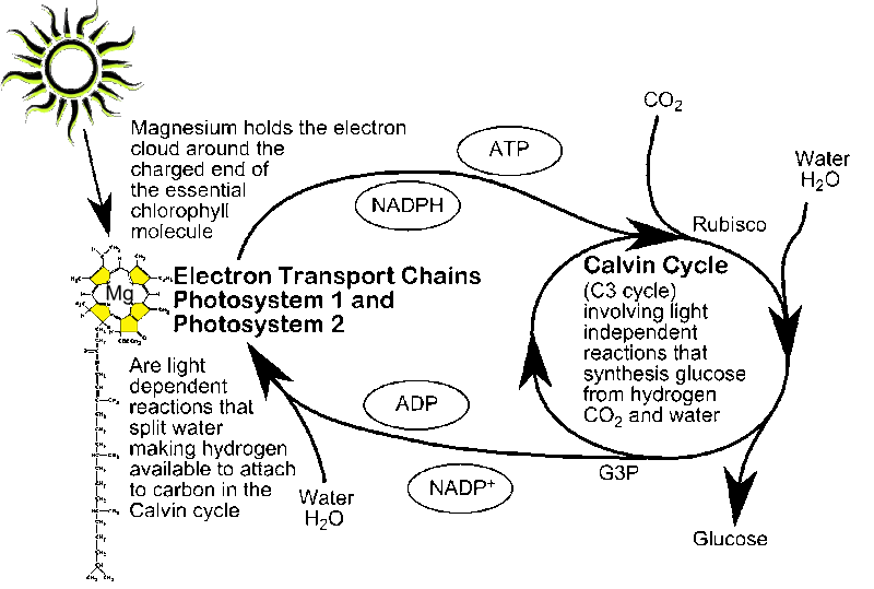 Magnesium ions are important in the chlorophyll molecule as their strong charge holds an electron cloud around a porphyrin ring that supplies electrons to the process. PSII as it is referred to is a photosynthetic process that splits water thereby supplying hydrogen ions and electrons to this cloud. These electrons pass through the process powering the Calvin cycle via NADP<=> NADPH in the PS1 process. The hydrogen ions are incorporated in glucose via the (ADP<=>ATP) cycle.