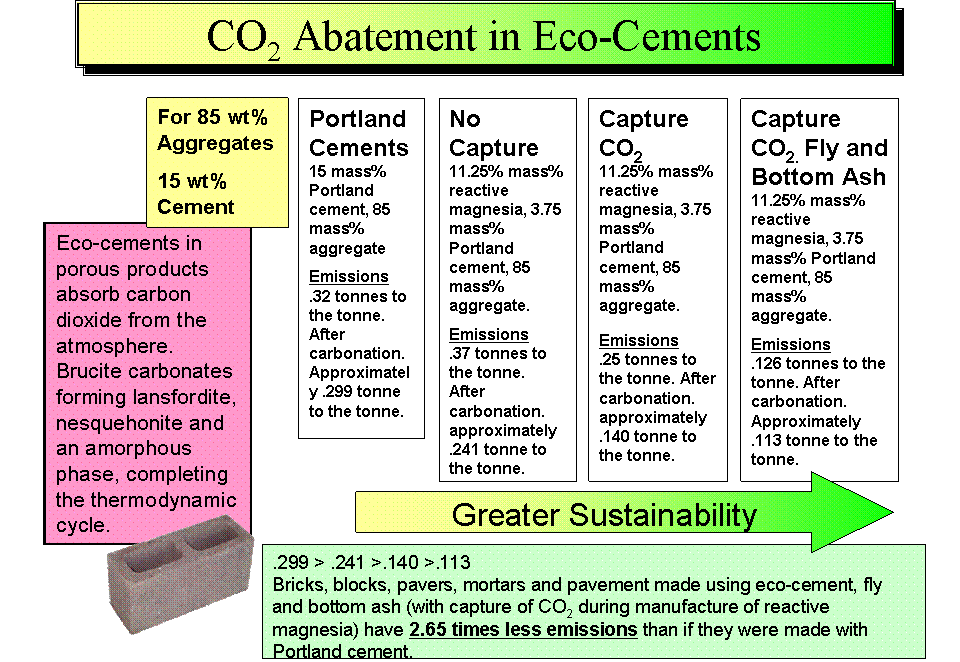 Eco-Cements are made by blending reactive magnesium oxide with conventional hydraulic cements like Portland cement. They are environmentally friendly because in permeable concretes the magnesium oxide will first hydrate using mix water and then carbonate forming significant amounts of strength giving minerals in a low alkali matrix. TecEco cement including Eco-Cement are also very un reactive. The result is that many different wastes can be used as aggregates and fillers without problems. The reactive magnesium oxide used in Eco-Cements is currently made from magnesite (a carbonate compound of magnesium) found in abundance. In the Gaia Engineering tececology the magnesia required will be produced from seawater.